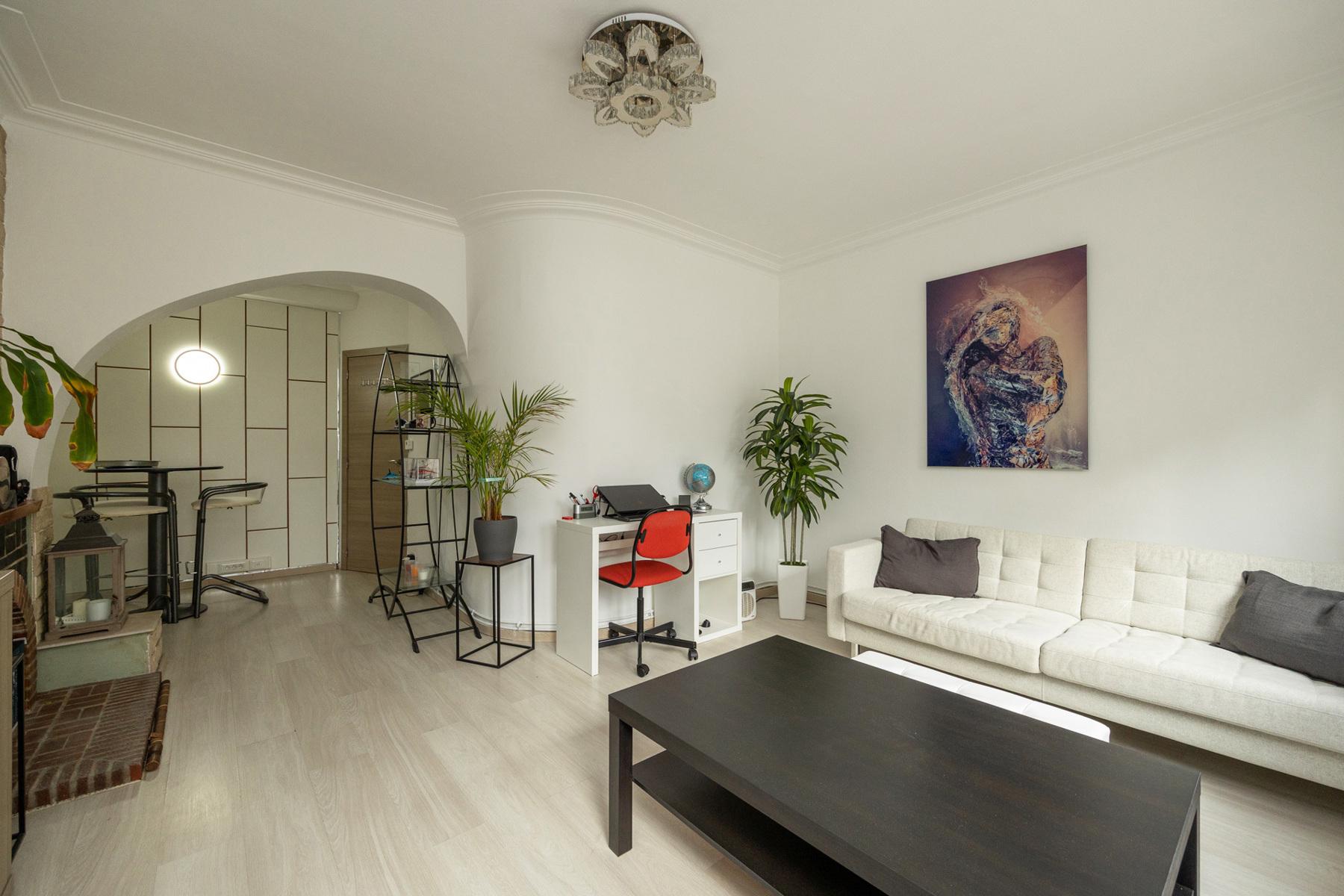 De leefruimte is aangenaam en lichtrijk en sluit aan op een praktisch ingerichte keuken. Hoewel de keuken compact is, werd ze efficiënt ingedeeld zodat alle nodige toestellen en opbergruimte optimaal benut worden. Functionaliteit en gebruiksgemak staan hier centraal.