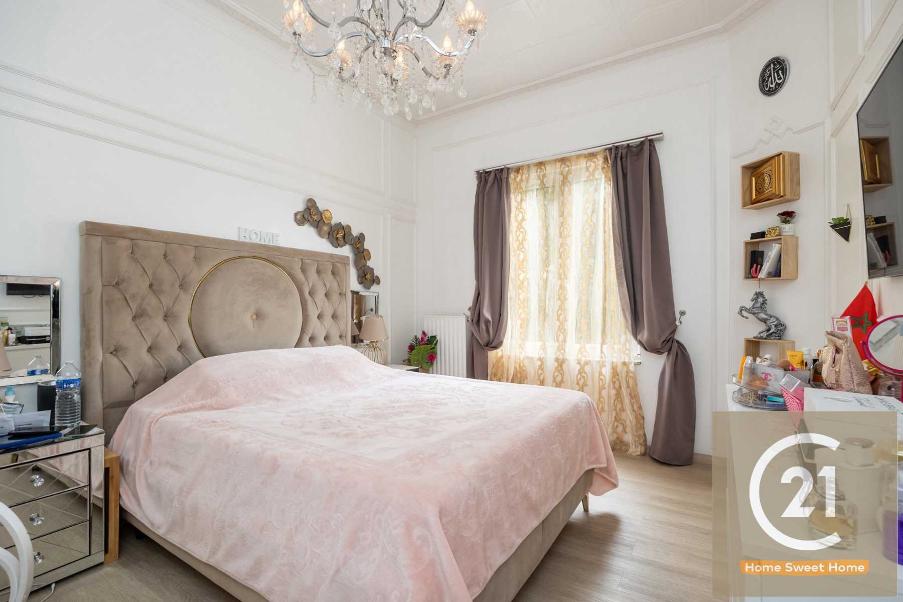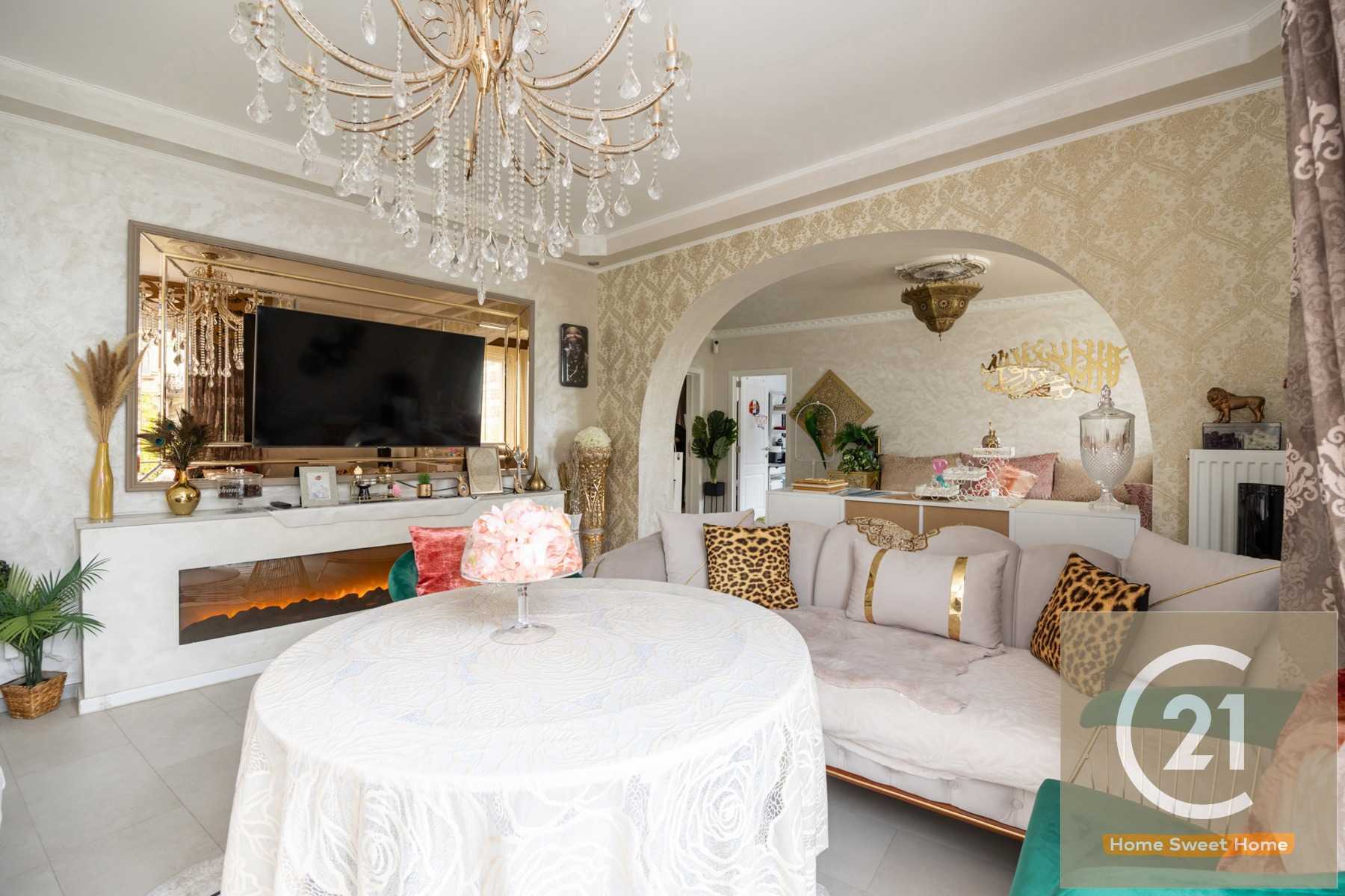 Bij het betreden van de woning kom je in een ruime leefruimte terecht die opvalt door zijn stijlvolle afwerking, decoratief plafond, kroonluchters en grote ramen die zorgen voor een aangename lichtinval. De gezellige zithoek sluit naadloos aan op de eetruimte en vormt een uitnodigende plek om te ontspannen.